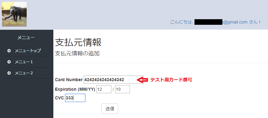 テスト用カード情報を入力して、[送信]ボタンを押下する