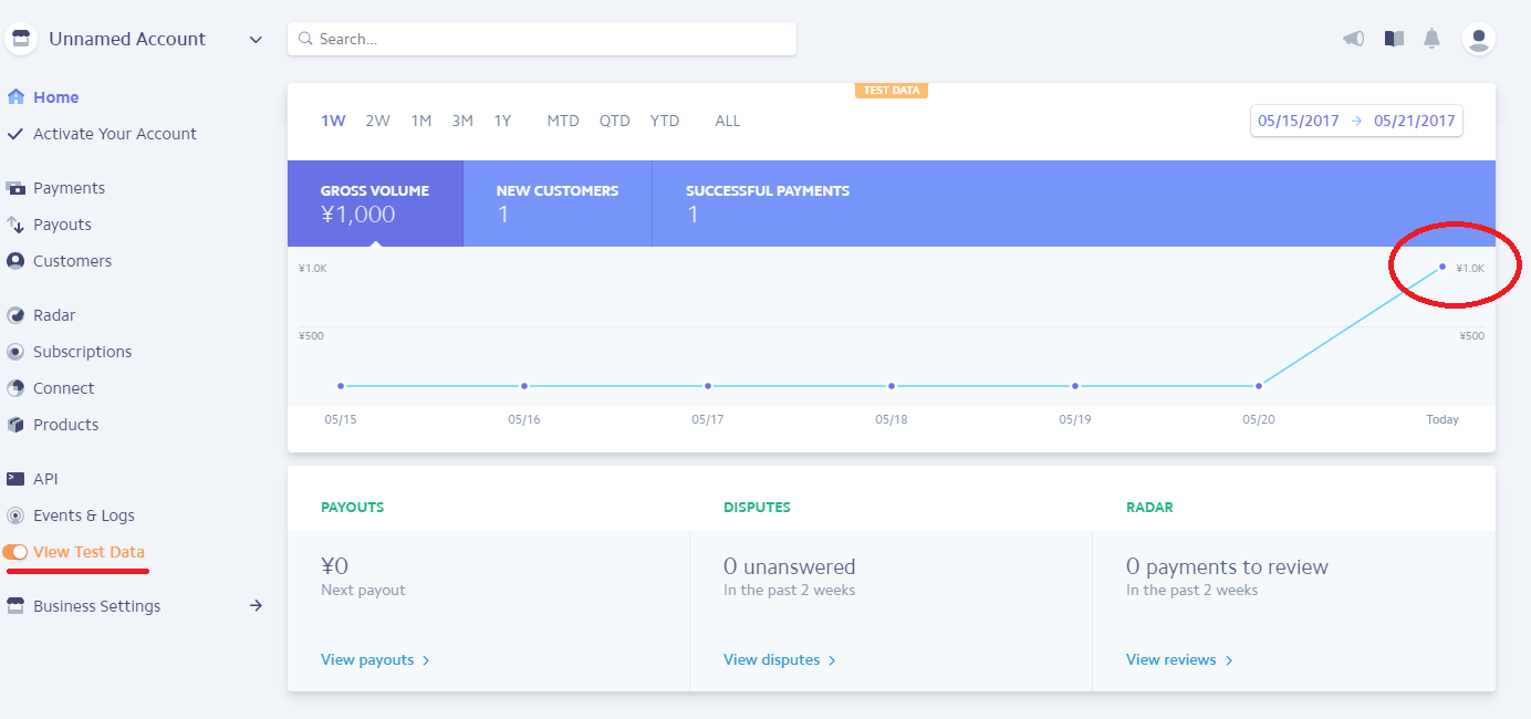 オンライン決済サービスにサインインし、ダッシュボード(テストモード)で課金を確認する。