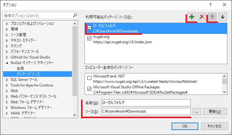 - コチラの方法で、ローカルフォルダをパッケージソースをとして追加する。