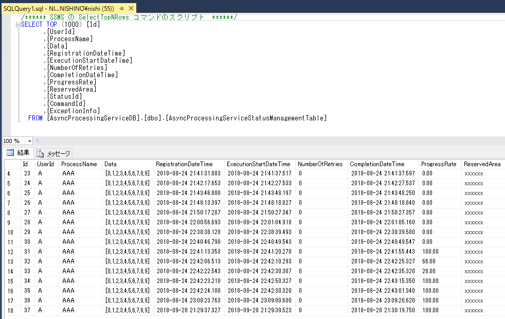 <connectionStrings> <!-- SQL Server / SQL Client用 --> <add name="ConnectionString_SQL" connectionString="Data Source=localhost\sqlexpress;Integrated Security=SSPI;Initial Catalog=AsyncProcessingServiceDB;"/> </connectionStrings>
