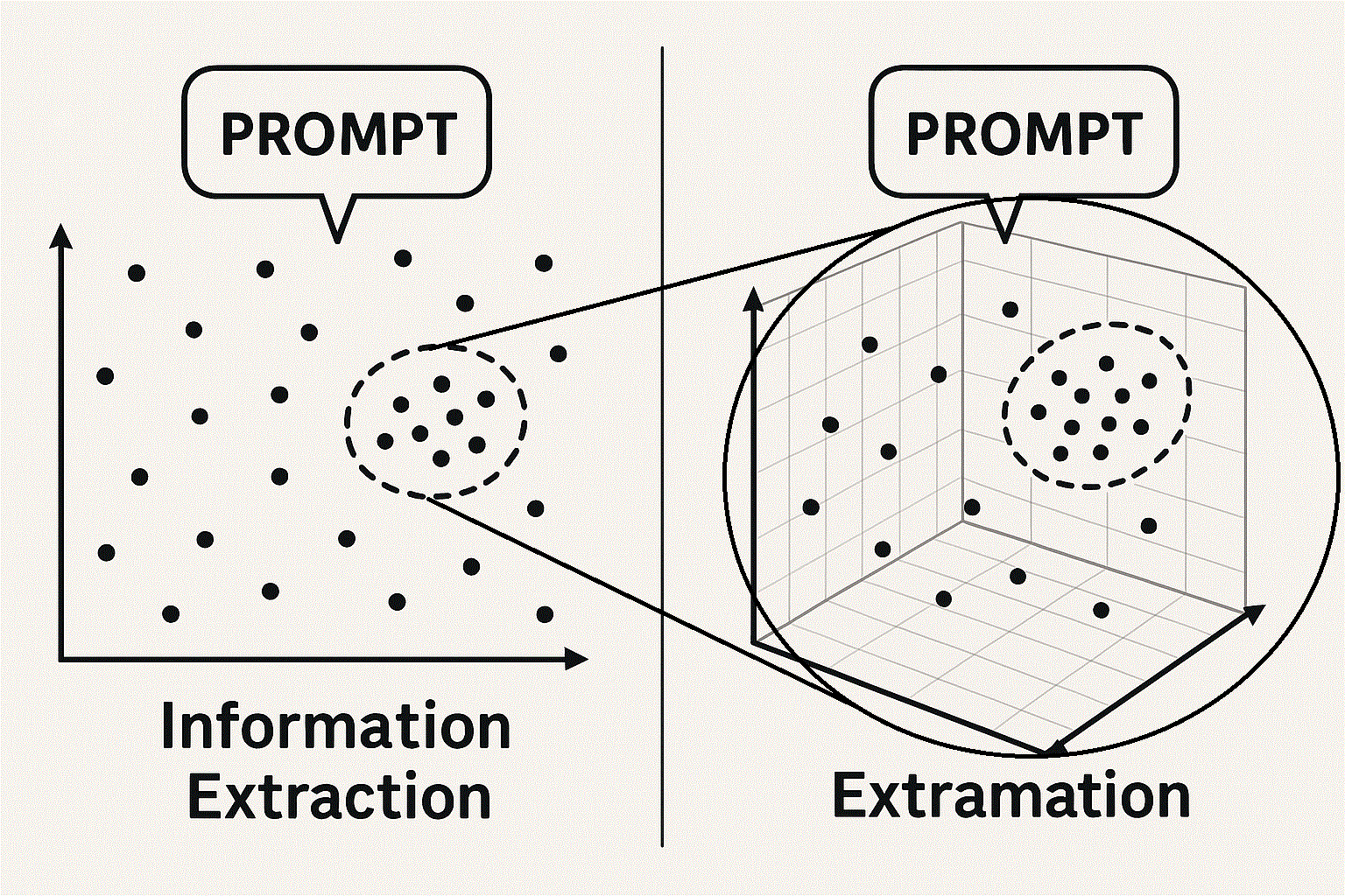 以下のような言語モデル生成AIの画像イメージを生成してください。 ・情報が空間(2次元散布図)上に散らばっているものとします。 ・プロンプトで2次元の集合から情報を抽出します。 ・プロンプトを追加する事で2次元の集合に次元を追加し3次元の集合から情報を抽出します。 ・集合からの情報抽出イメージは1つのプロットではなく複数のプロットを含む集合をポイントします。 ・3次元の図については立体感を出してください。